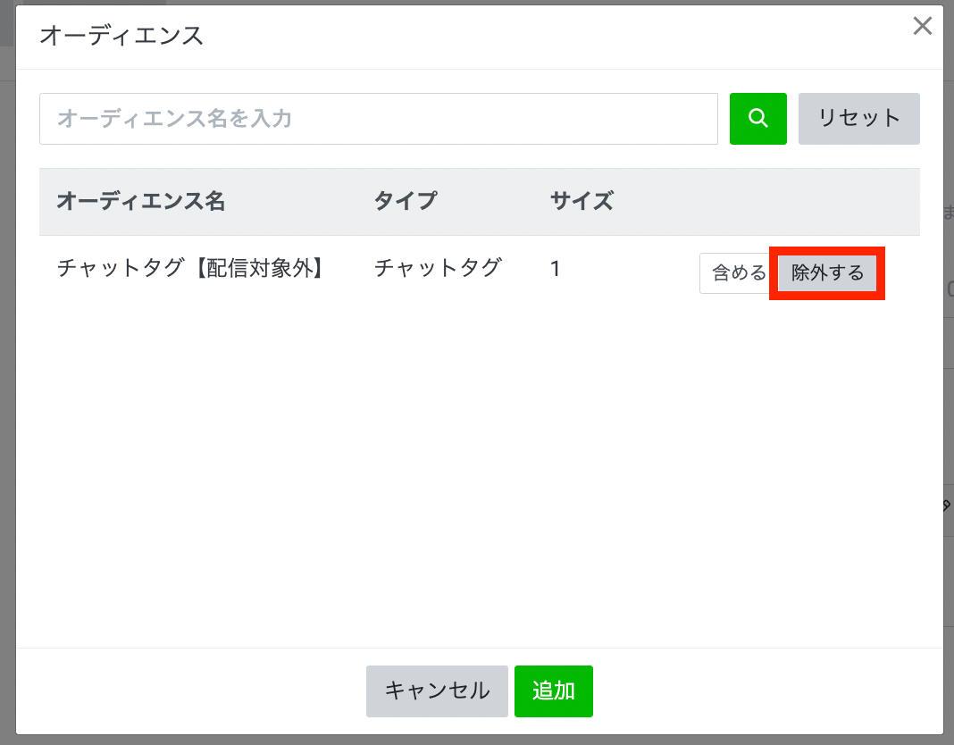 先ほど紹介した「チャットタグ」もオーディエンスの一つです。これらのオーディエンスを「除外して」配信することができます。
