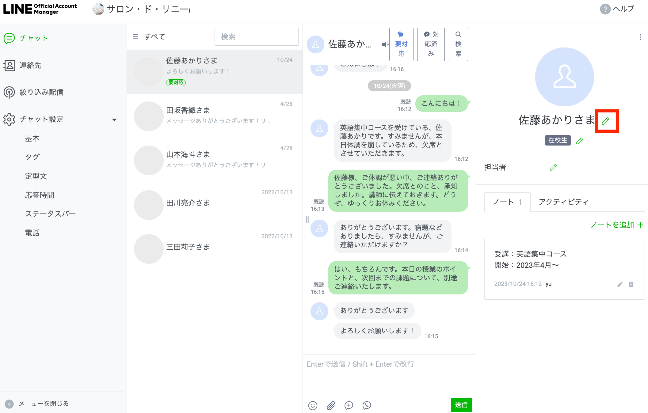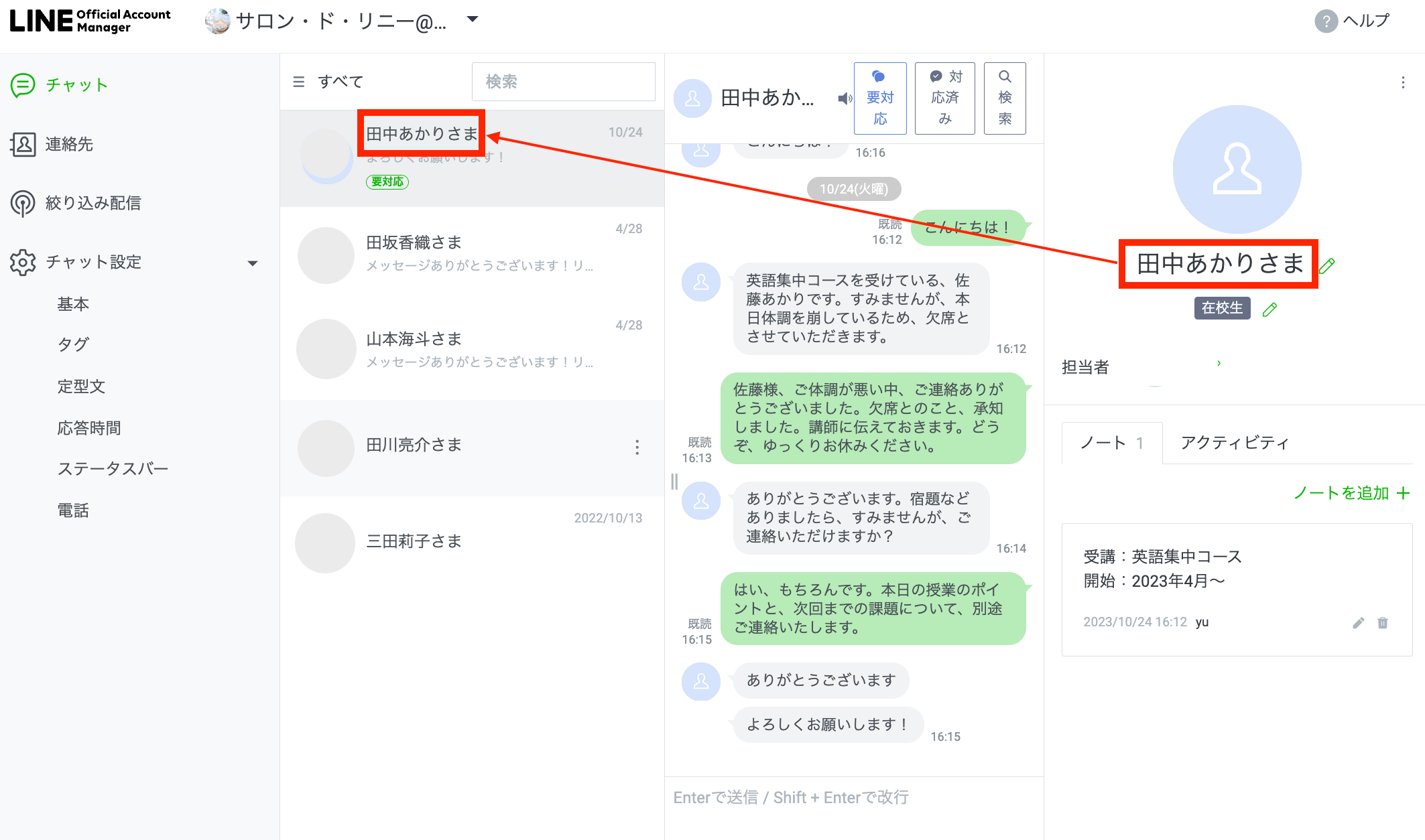 ここまで、アカウントの友だちの名前・表示名の変更方法をお伝えしてきました。冒頭でお伝えしたように、LINE公式アカウントではチャットができる友だちの名前しか確認・変更することができません *。