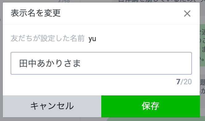 ポップアップが表示されるので、ここで運用上の名前を設定します。変更した表示名は、友だち側には通知されません。また、ポップアップ内では友だち自身が設定している名前を、確認することができます。