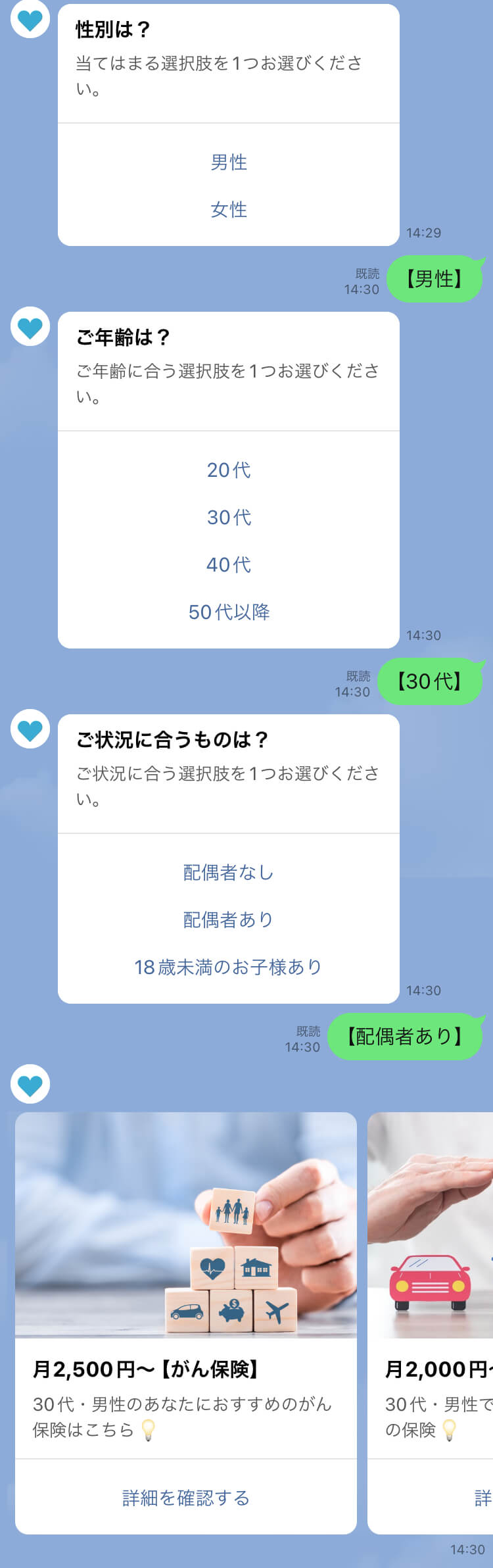 Linyでは診断機能を作ることもできます。簡単な見積もりであれば、質問にタップするだけで、概算を表示させることが可能です。「参考程度にどれぐらいの料金になるのかを知りたい」という方に、気軽に使ってもらうことができます。