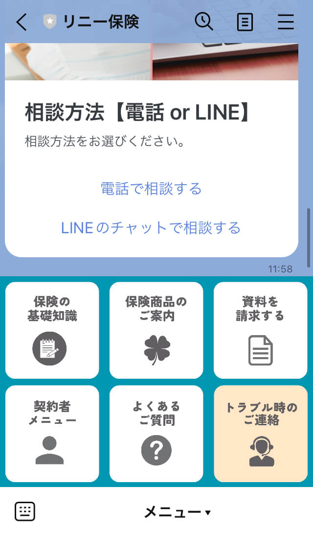 例えば、ユーザーから事故やトラブル発生時の連絡を受け付ける際、リッチメニューのタップで、自動でメッセージを送付し、案内窓口を切り分けることができます。