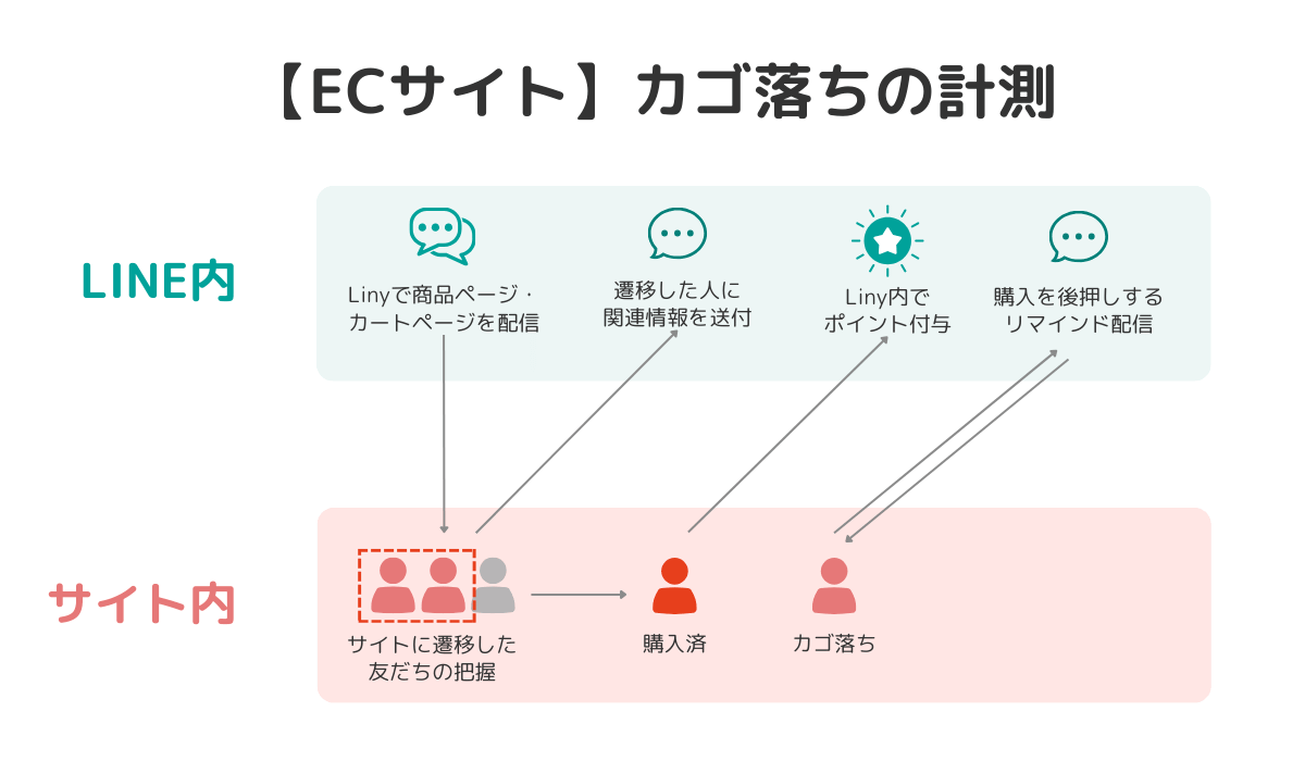 ECサイトでは、商品をカートに入れたものの購入に至らない、「カゴ落ち」が課題となることがあります。Linyを活用することで次のような運用が可能です。
