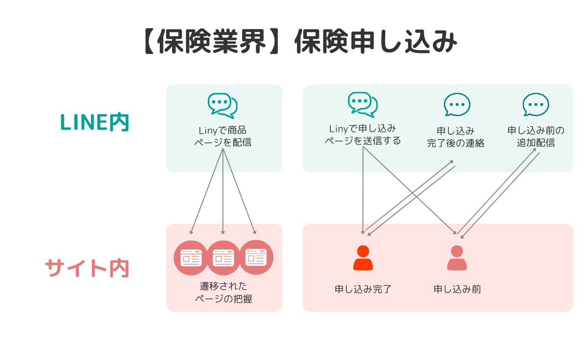 保険サービスで自社サイトの申し込みフォームを利用する場合、Linyを活用することで次のような運用が可能です。
