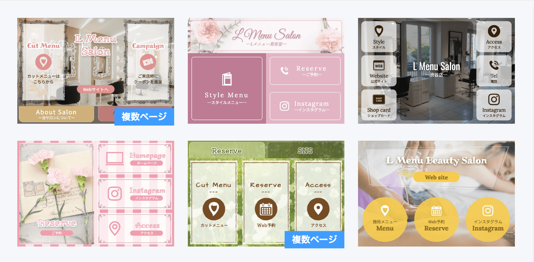 プレーンなフォーマットから、飲食店、サロン、教室など、用途別に作り込まれたデザインまで用意されており、希望のデザインを選択するだけで、リッチメニューの土台を作ることができます。
