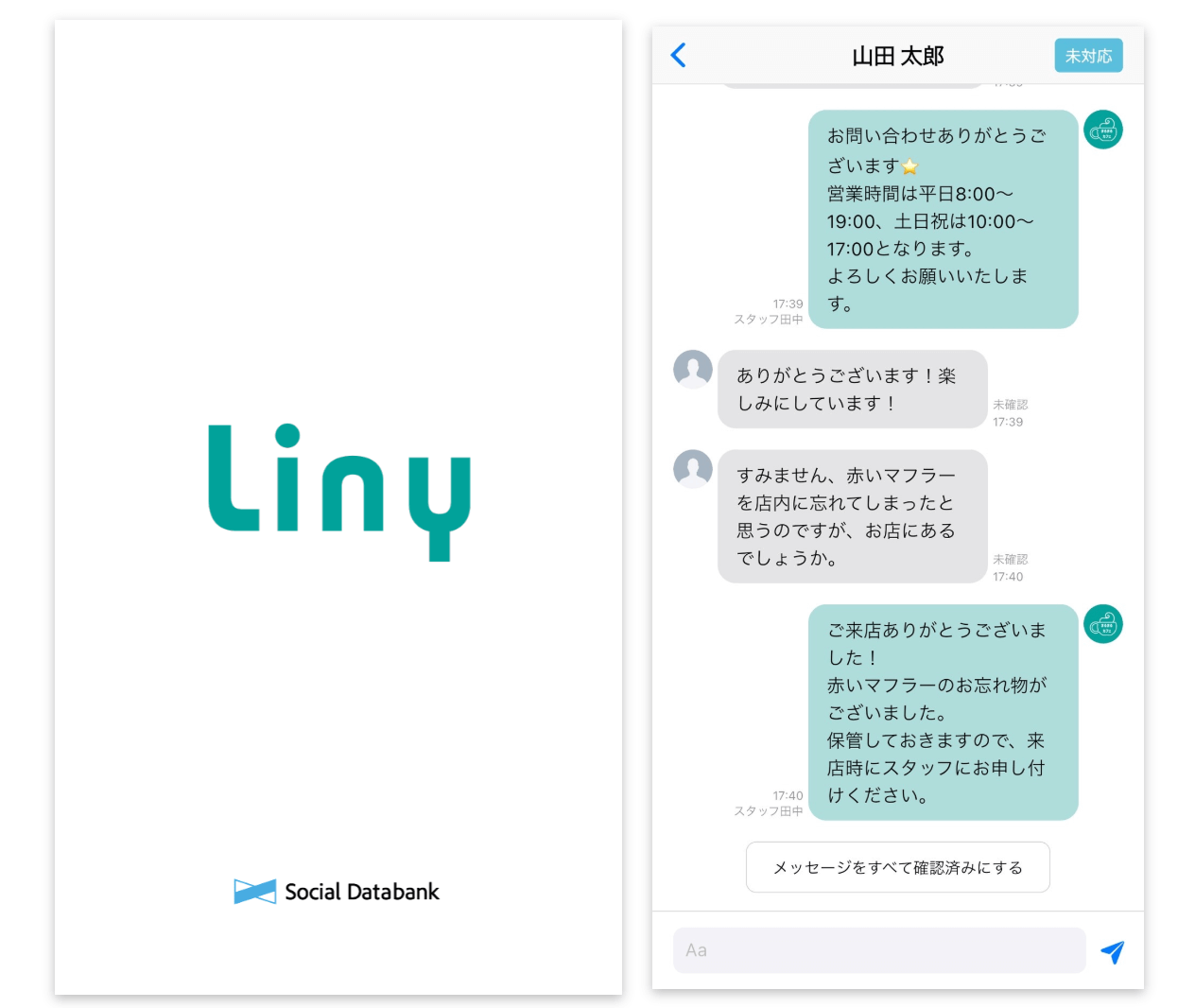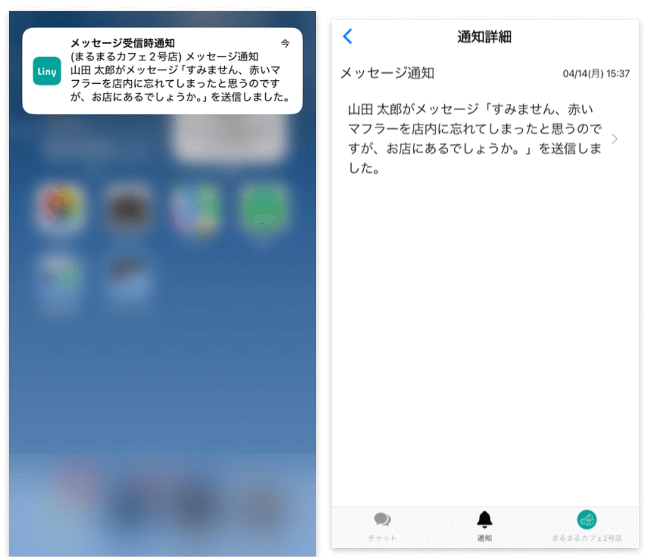 Linyスマートフォンアプリでは、ユーザーとのチャットのやりとりや、通知の受け取りが可能です。通常の運用と合わせて利用することで、緊急時の対応などがスムーズに行えます。