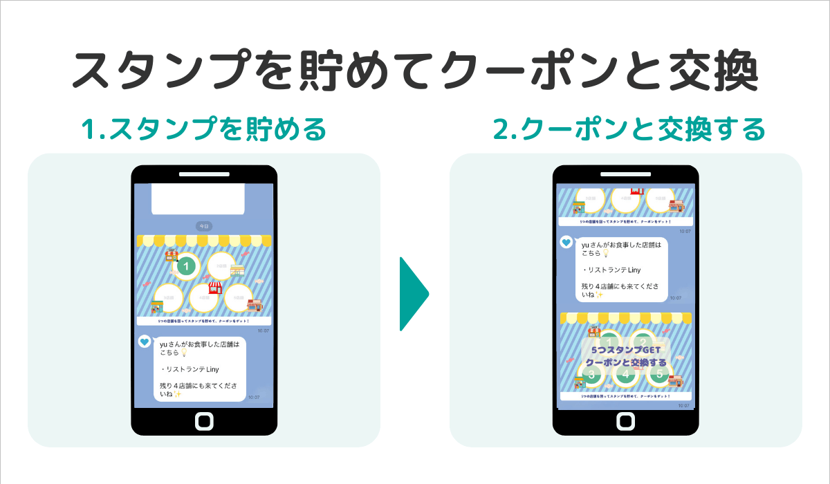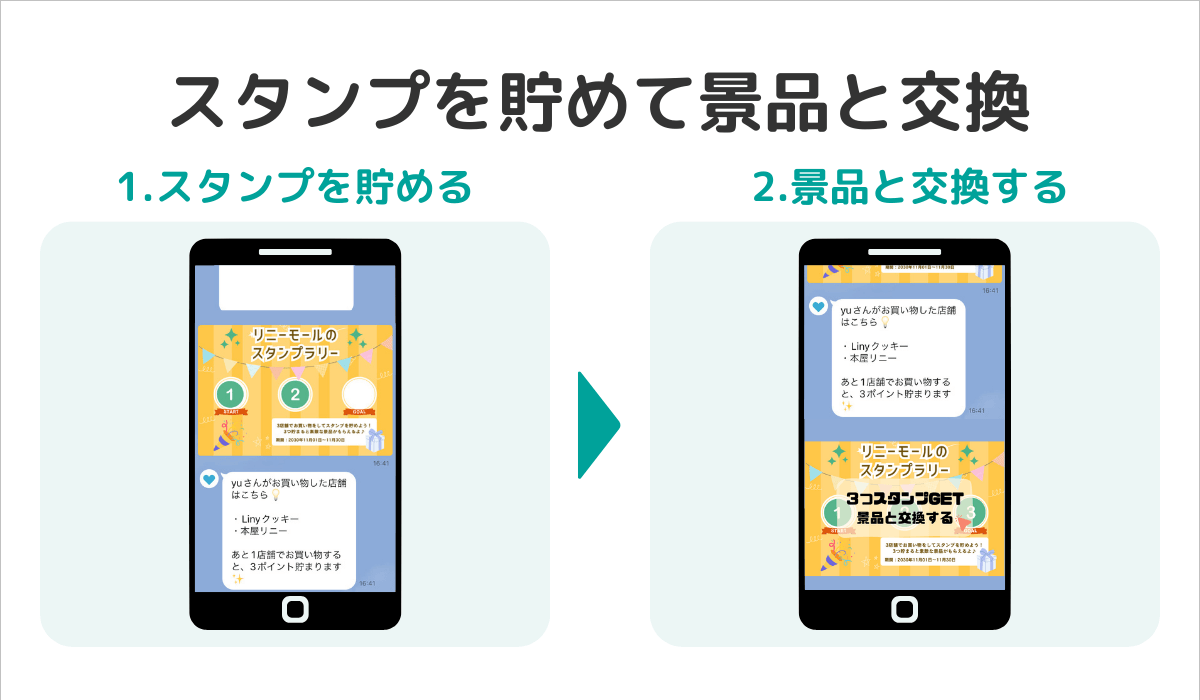しかし、LINE公式アカウントの機能だけでは細かな設定が難しいという課題があるため、LINE公式アカウントのサポートツールであるLinyが用いられています。Linyを使えば、スタンプラリーだけではなく、ポイントをためて抽選に応募できる仕組みも作ることができます。