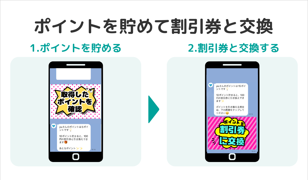 例えば、お買い物ごとにポイントを付与して、10ポイント貯まったら100円引きの割引券と交換するといったキャンペーンの実施が可能です。
