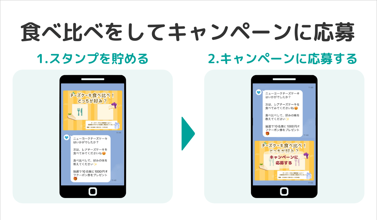 メーカーや小売店では、特定の商品を購入することで、スタンプやポイントを貯める仕組みが作れます。例えば、2種類の商品を購入してスタンプを貯めることで、景品に応募できるキャンペーンを作成することができます。
