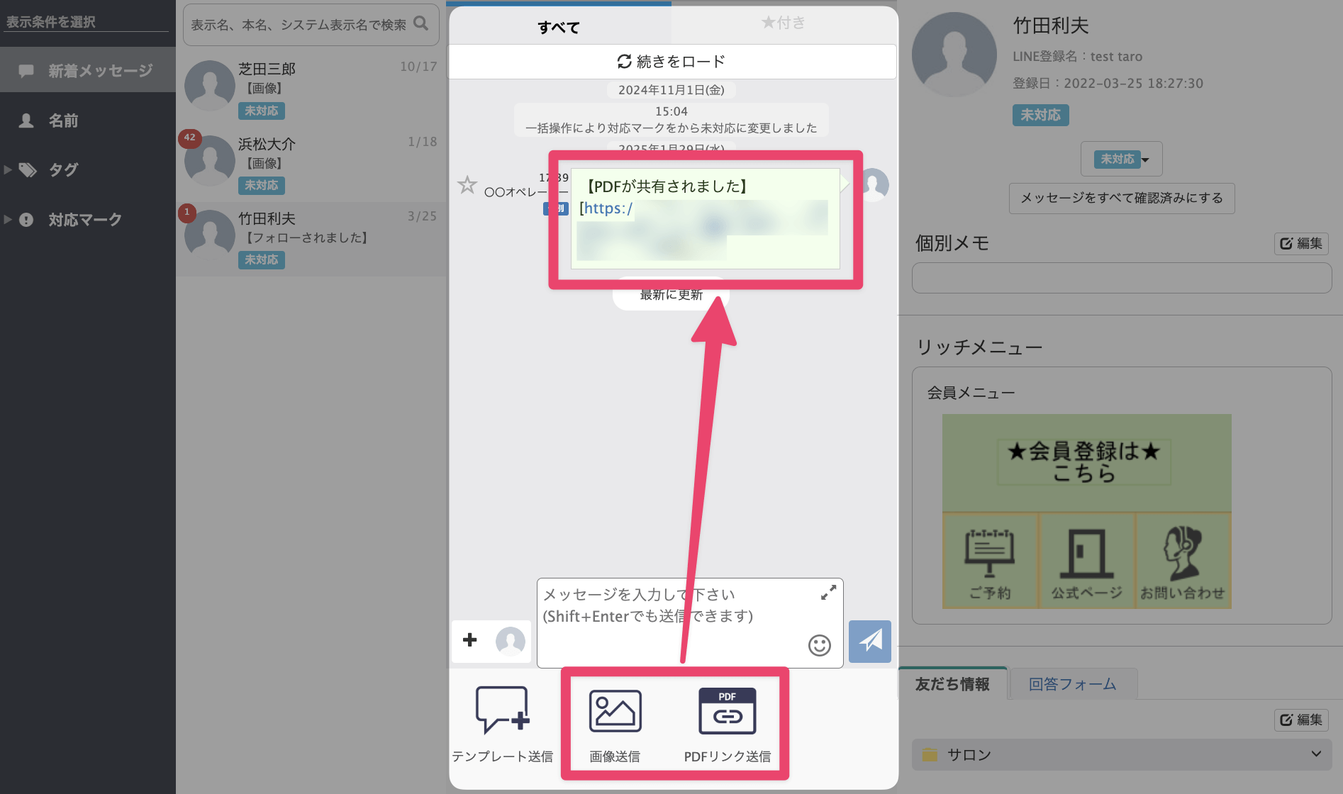 オペレーター権限設定にある「メッセージ送信の設定」では、画像やPDFリンクの送信を許可するかどうかを設定できます。送信を許可されたオペレーターは、画像やPDFリンクをアップロードして友だちに送信できます。これにより、よりスムーズなオペレーションが可能になります。