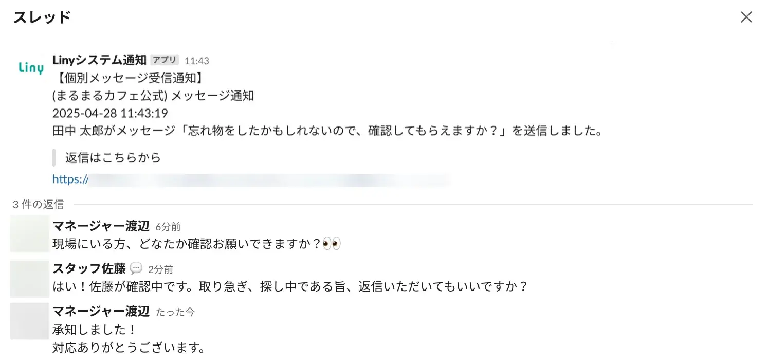 2025年12月のアップデートで、複数人のスタッフが1つのチャットルームで同時にLinyの通知を受け取れる「スタッフチャット機能」を実装しました。 スタッフチャット機能については、こちらの記事で詳しく紹介しています。