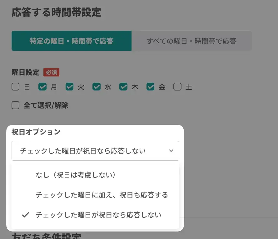 自動応答の応答する曜日設定で、祝日を考慮した設定ができるようになりました。祝日に友だちからメッセージが届いたとき、「応答するかしないか」をオプションで選択できます。