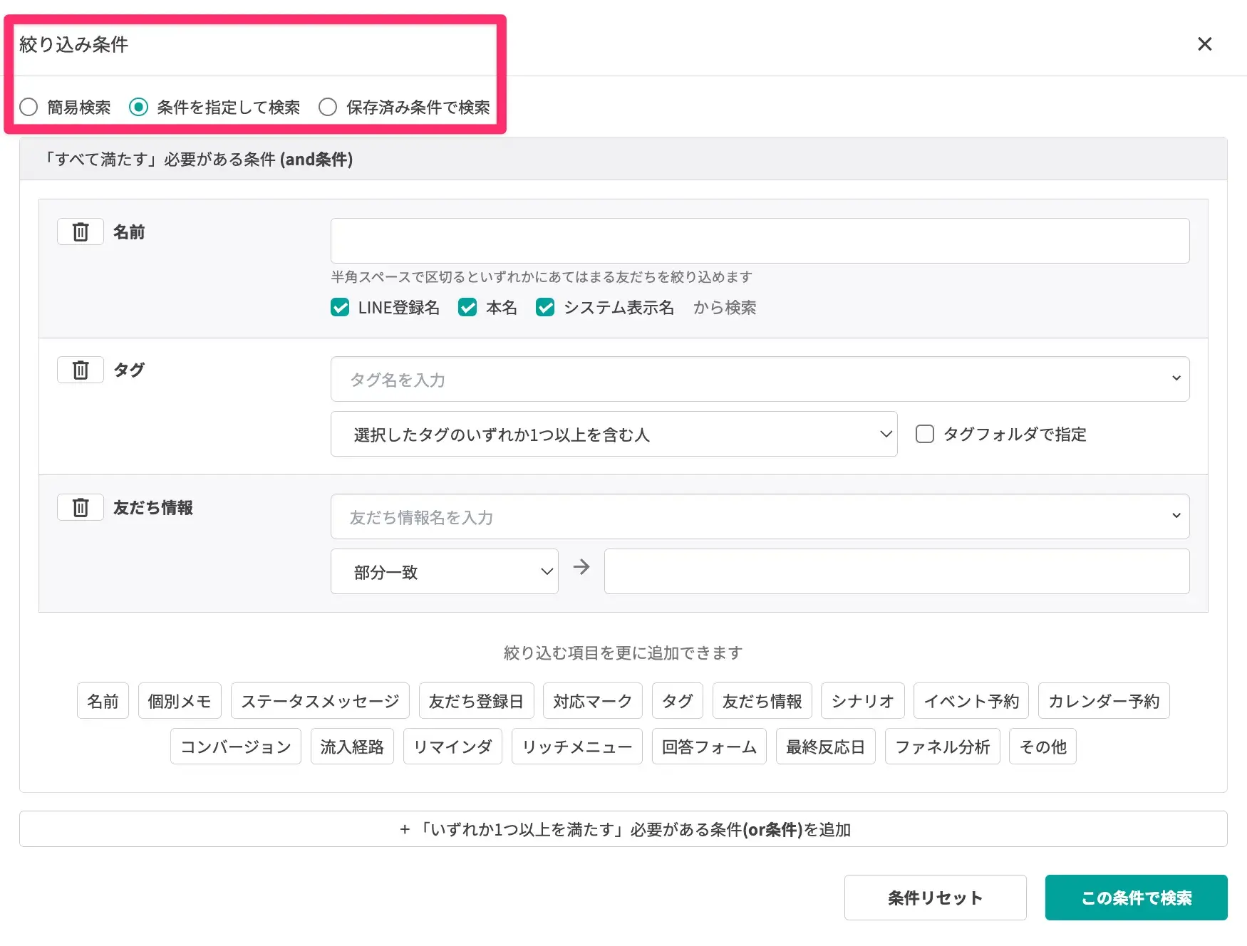 - 頻繁に使う絞り込みを繰り返し使用したい場合→「保存済み条件で検索」
