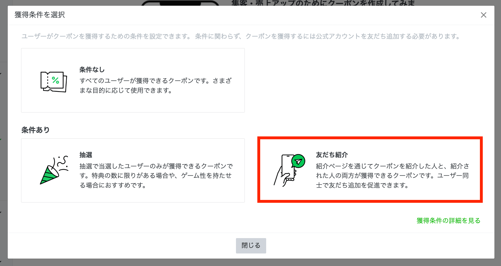獲得条件の選択画面が表示されるので「友だち紹介」をクリックします。
