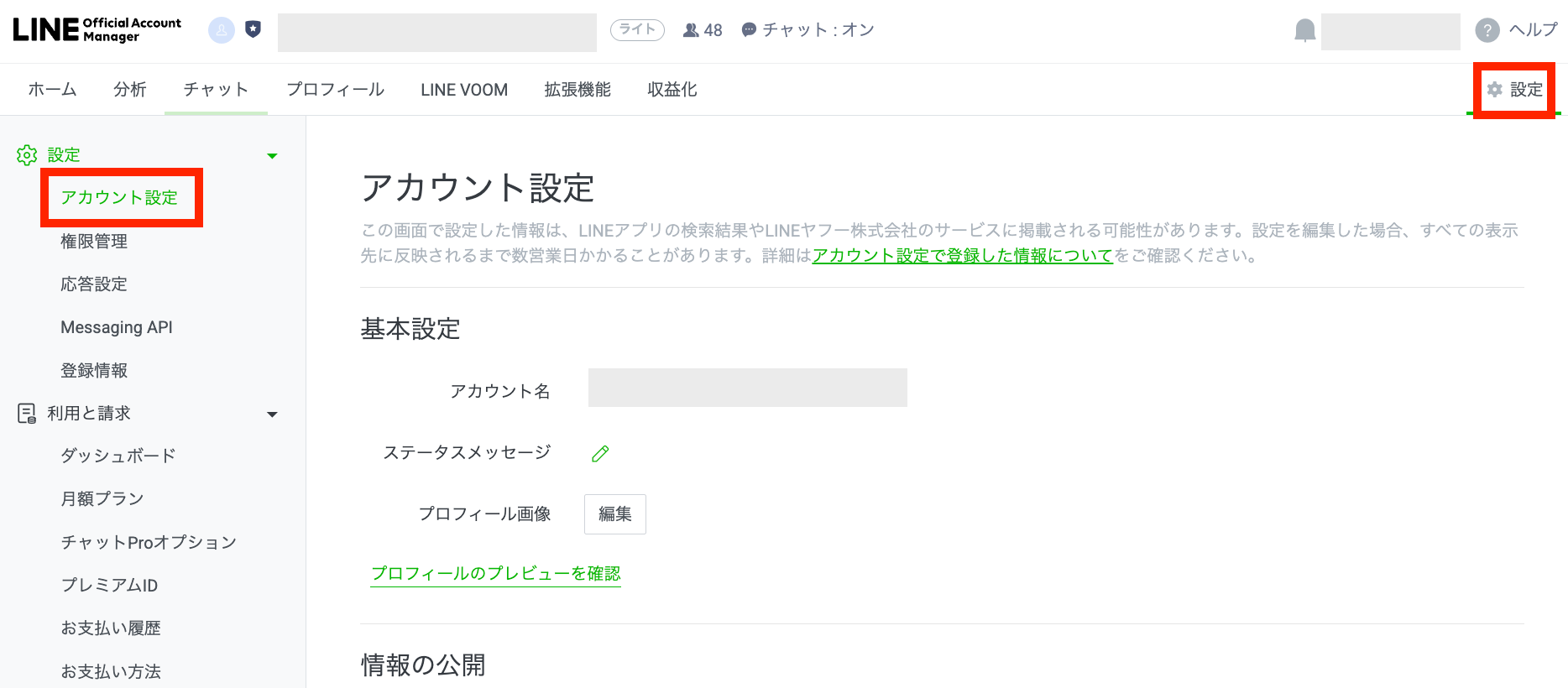 LINE公式アカウントの管理画面、右上にある「設定」をクリックし、「アカウント設定」を開きます。