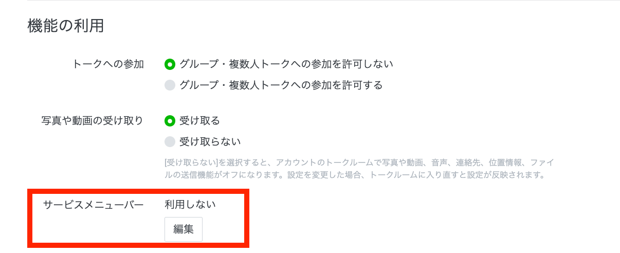 「権限の利用」の項目内に、「サービスメニューバー」があるので、編集をクリックします。