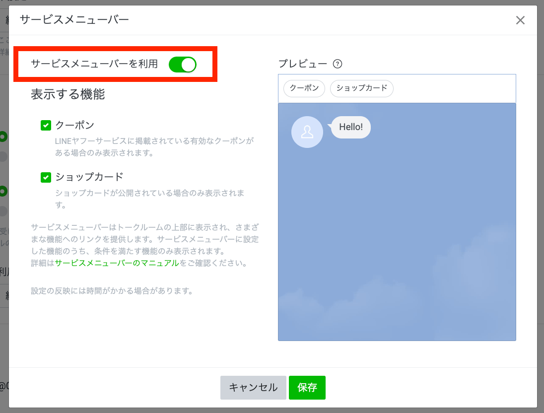 ポップアップが表示されるので、「サービスメニューバー」を「オン」にします。「表示する機能」で、サービスメニューバーに表示したい内容を選択して保存します。