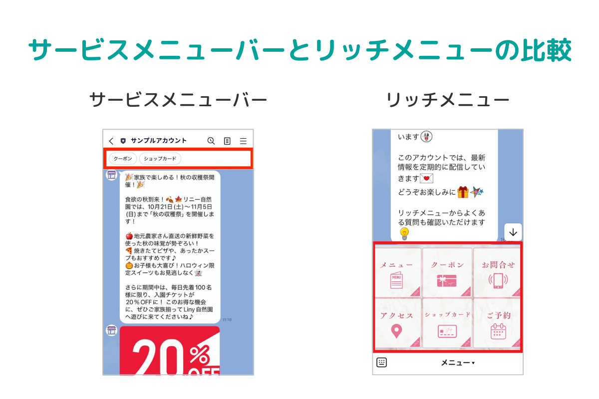 トーク内にメニューを固定する機能としては、サービスメニューバー以外にリッチメニューがあります。それぞれの違いをまとめてみました。