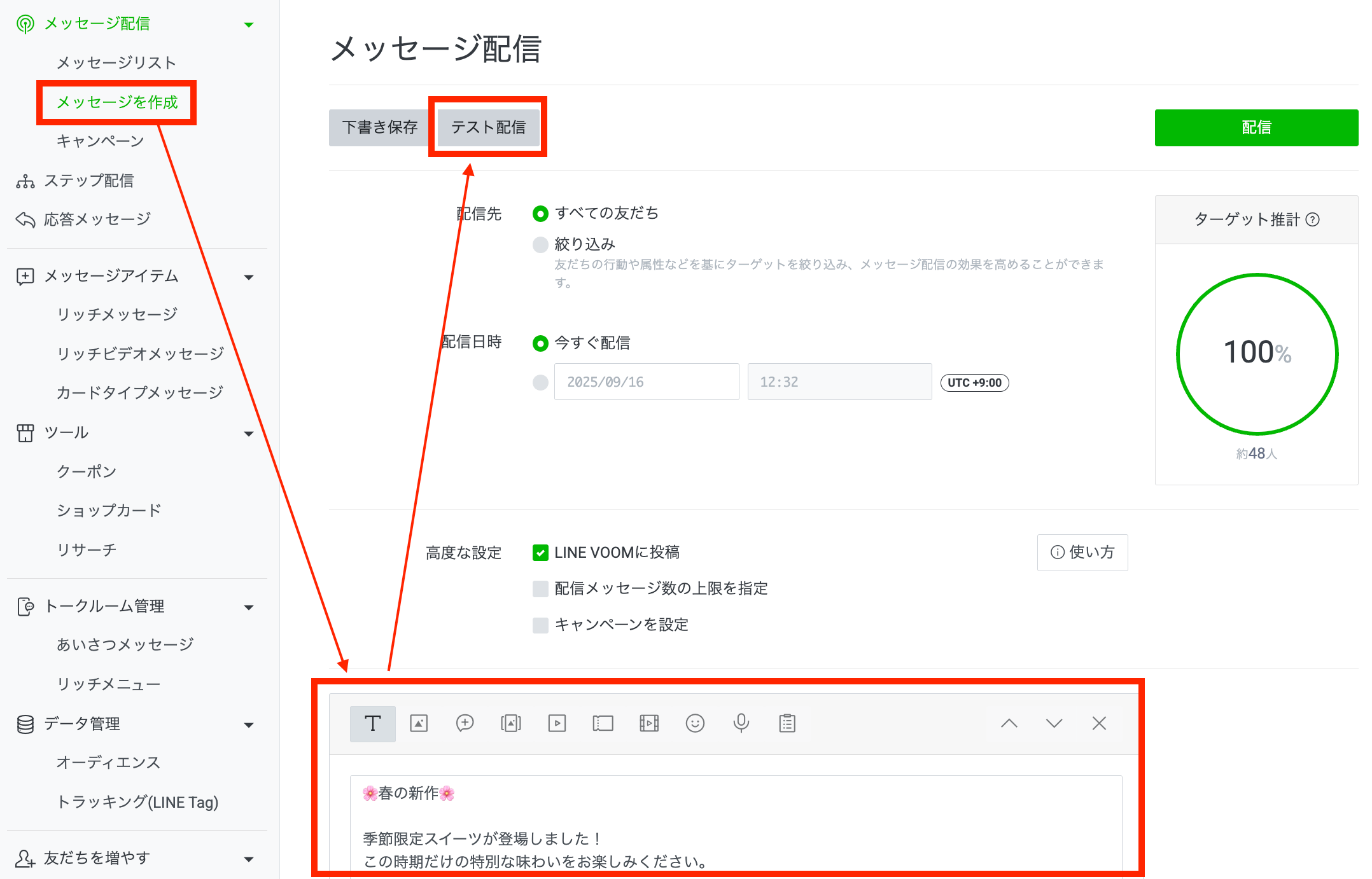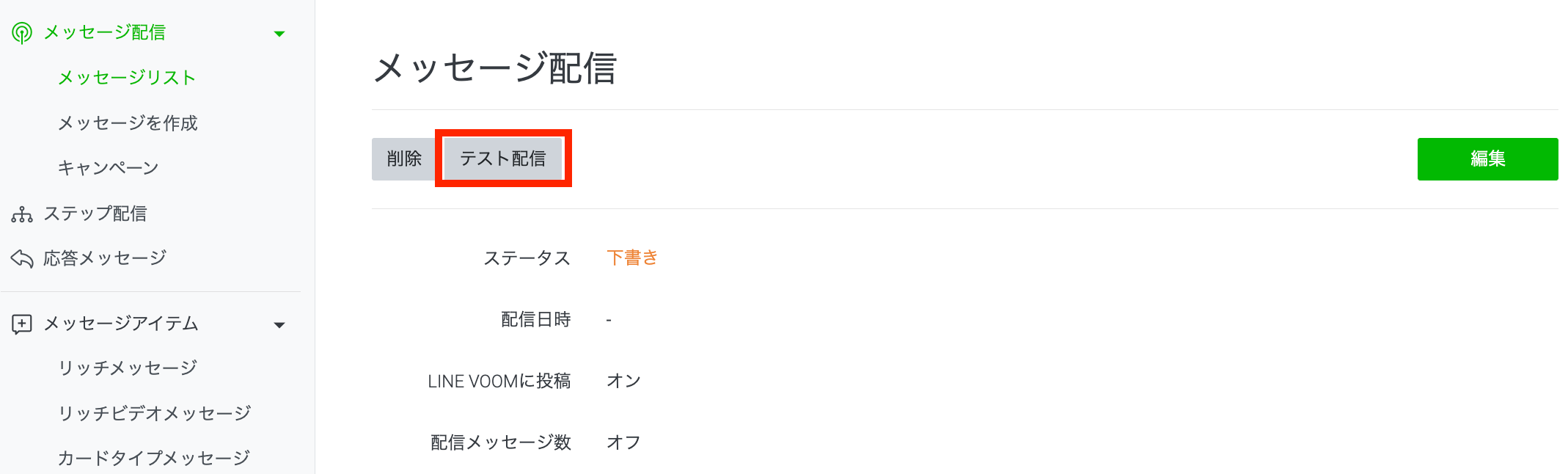 管理画面で「メッセージを作成」を選択し、配信するメッセージを設定します。その後、上部にある「テスト配信」をクリックします。