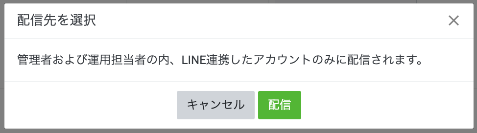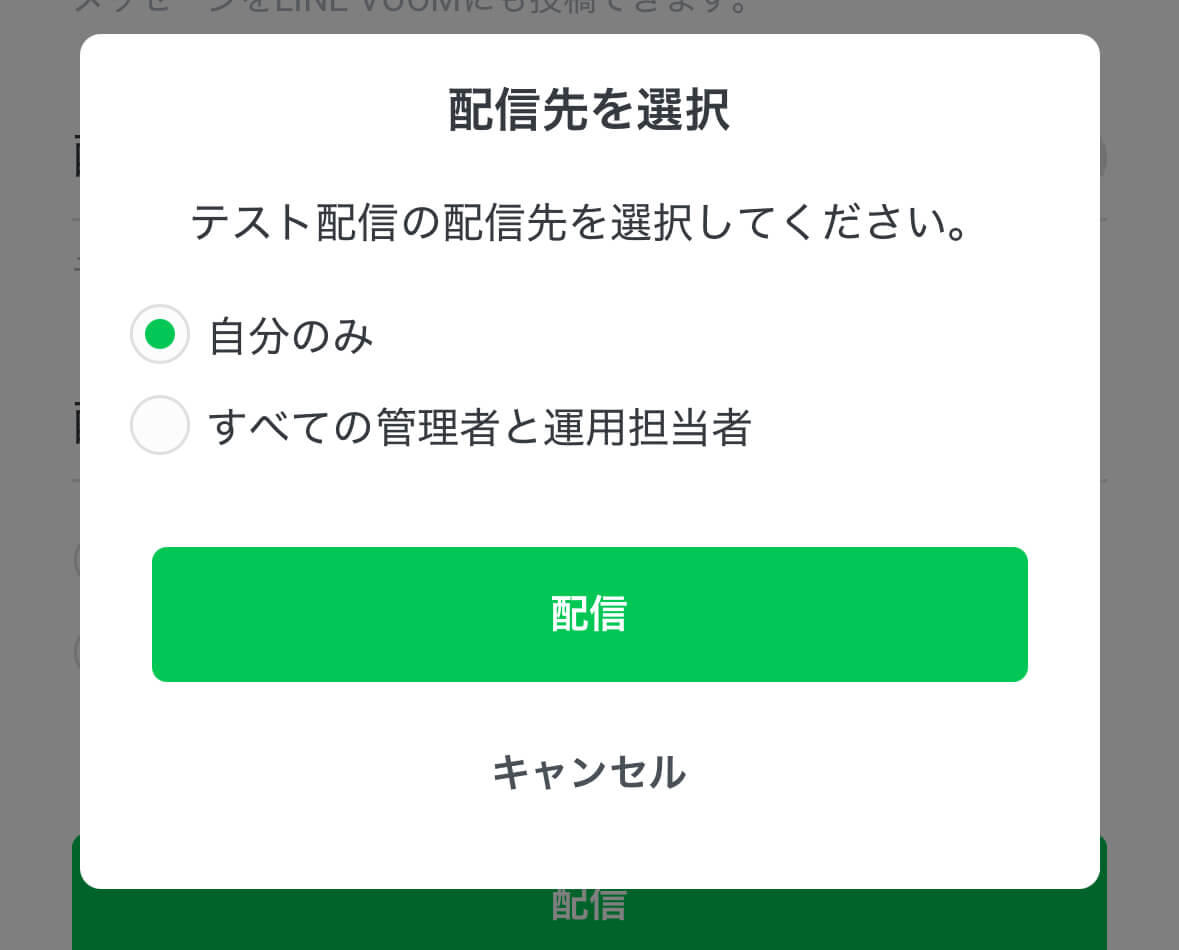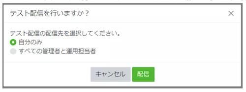 LINE連携している場合、テスト配信先を「自分のみ」「すべての管理者と運用担当者」から選択して配信します。