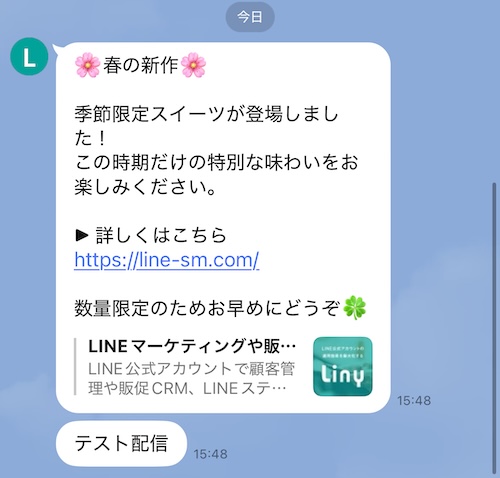 配信が完了すると、LINEアプリに「テスト配信」という文言とともに、設定したメッセージ内容が届きます。