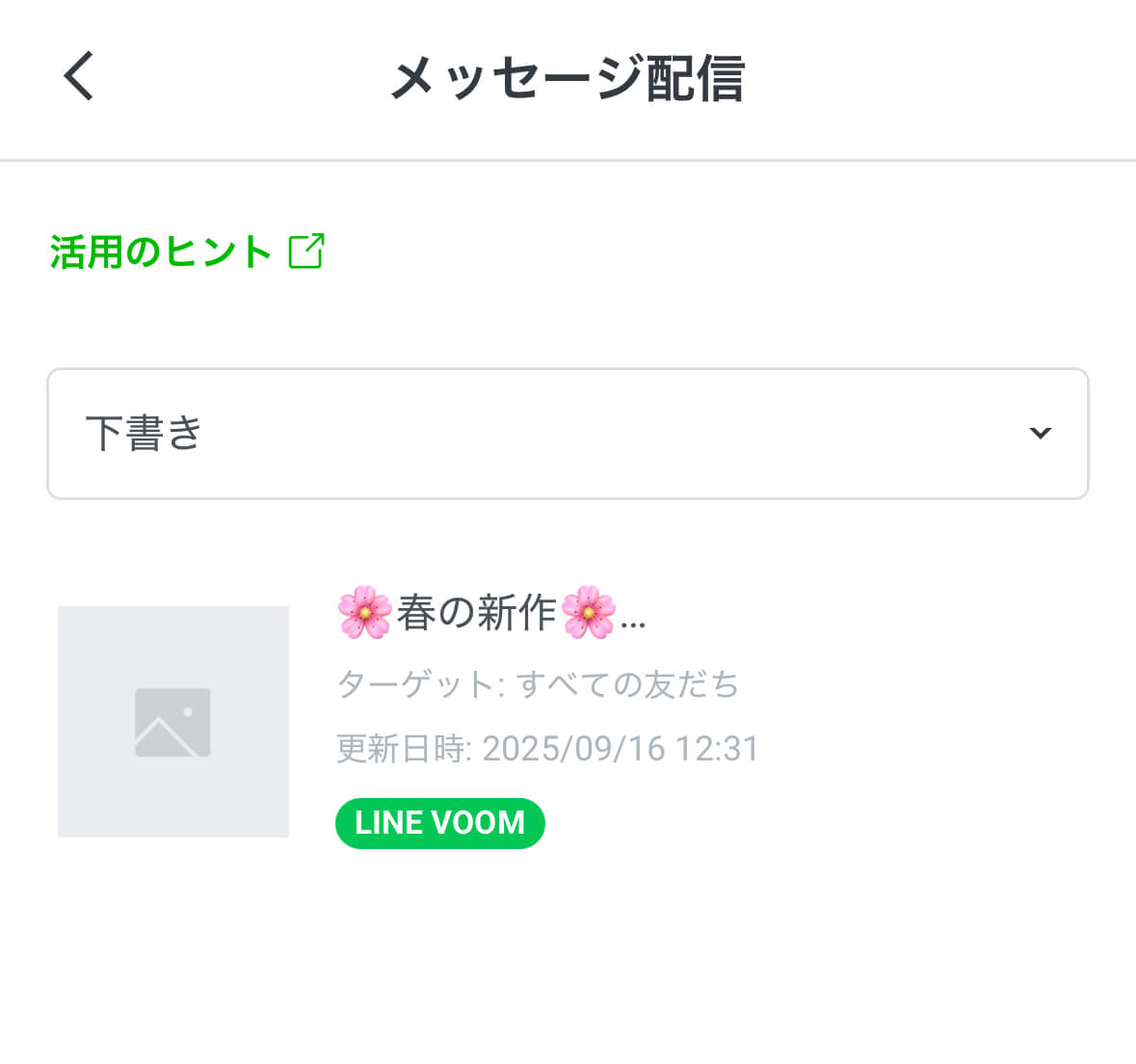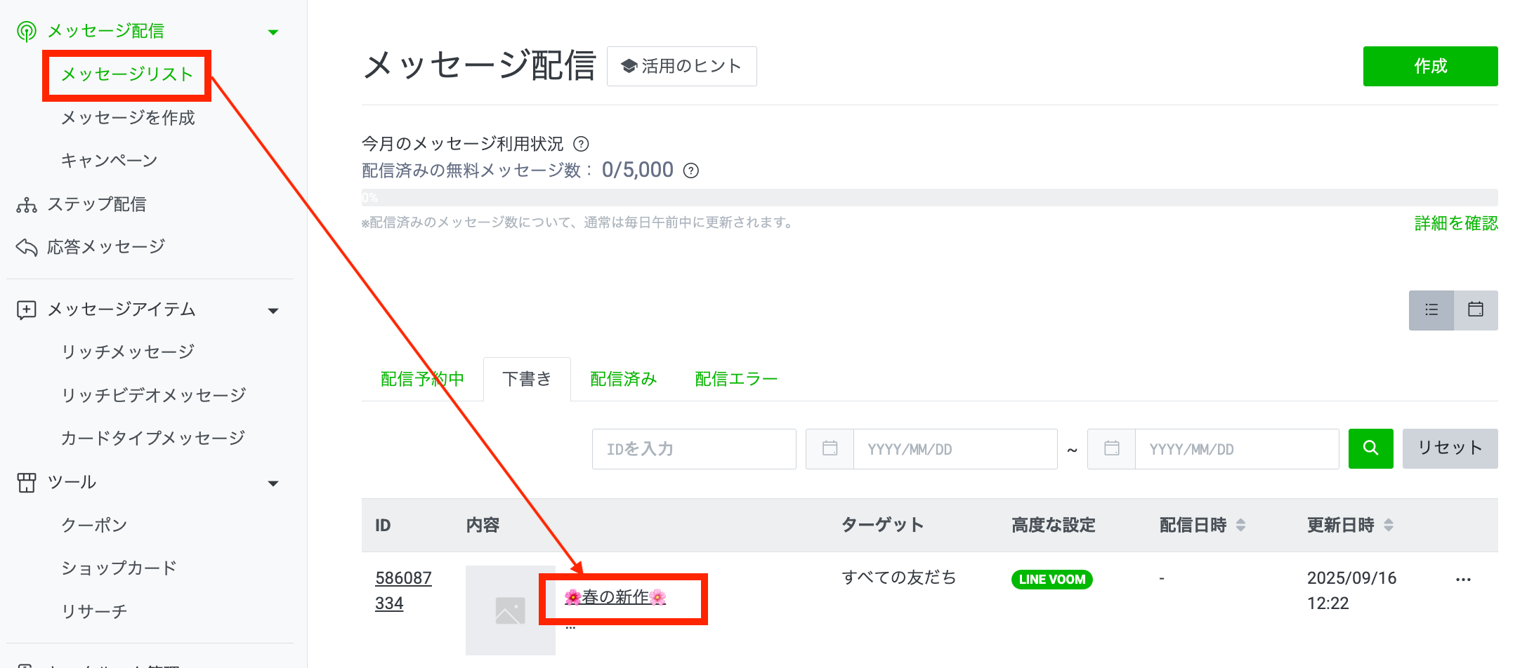 下書き保存したメッセージは「メッセージ配信」>「メッセージリスト」にあります。該当のメッセージをクリックします。