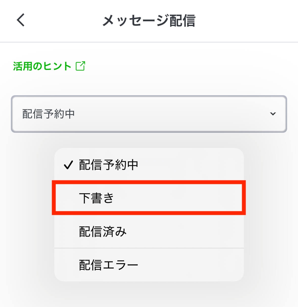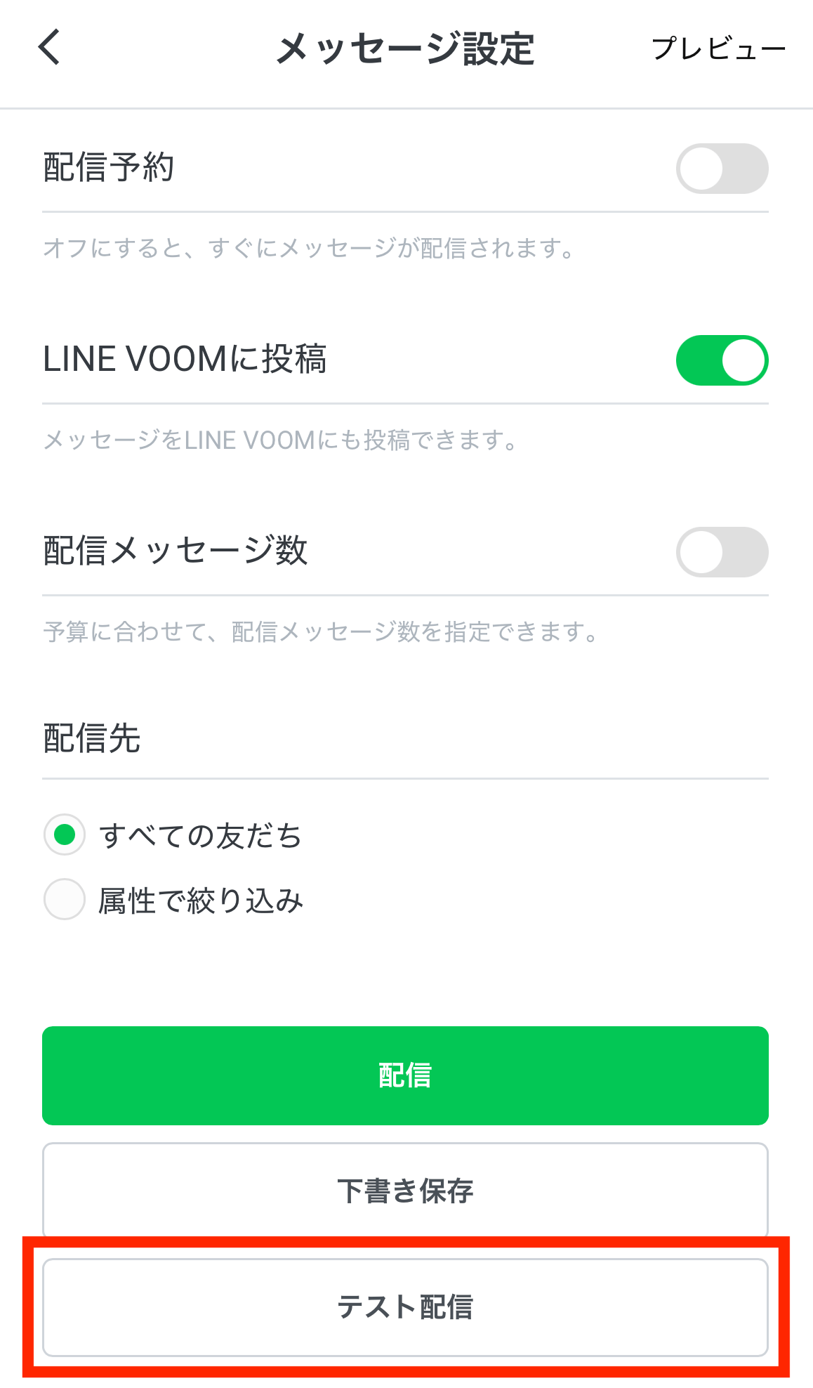 スマホアプリからでも、「下書き保存」したメッセージのテスト配信が可能です。