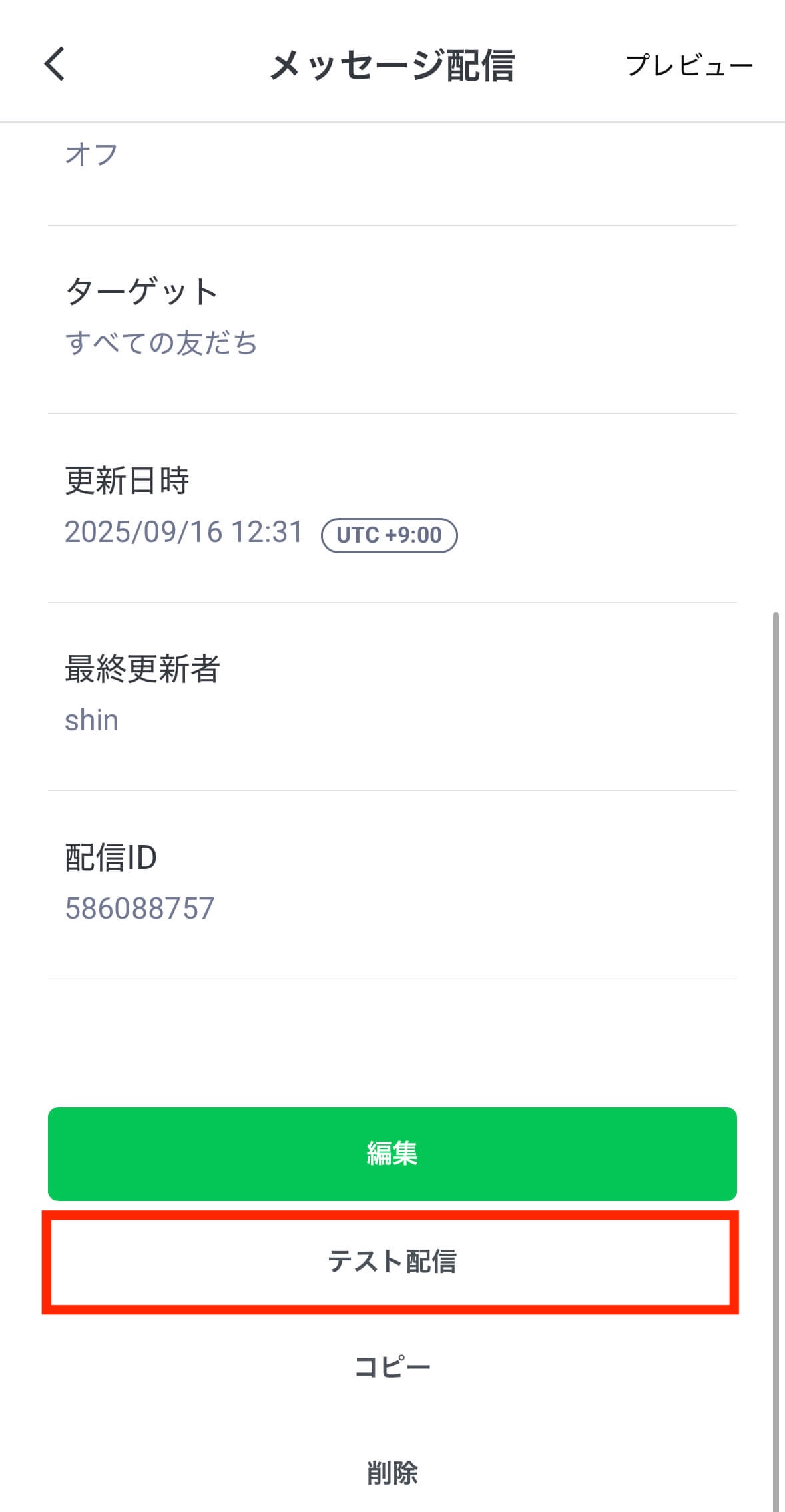 「テスト配信」をタップして、同様にテスト配信を実施します。