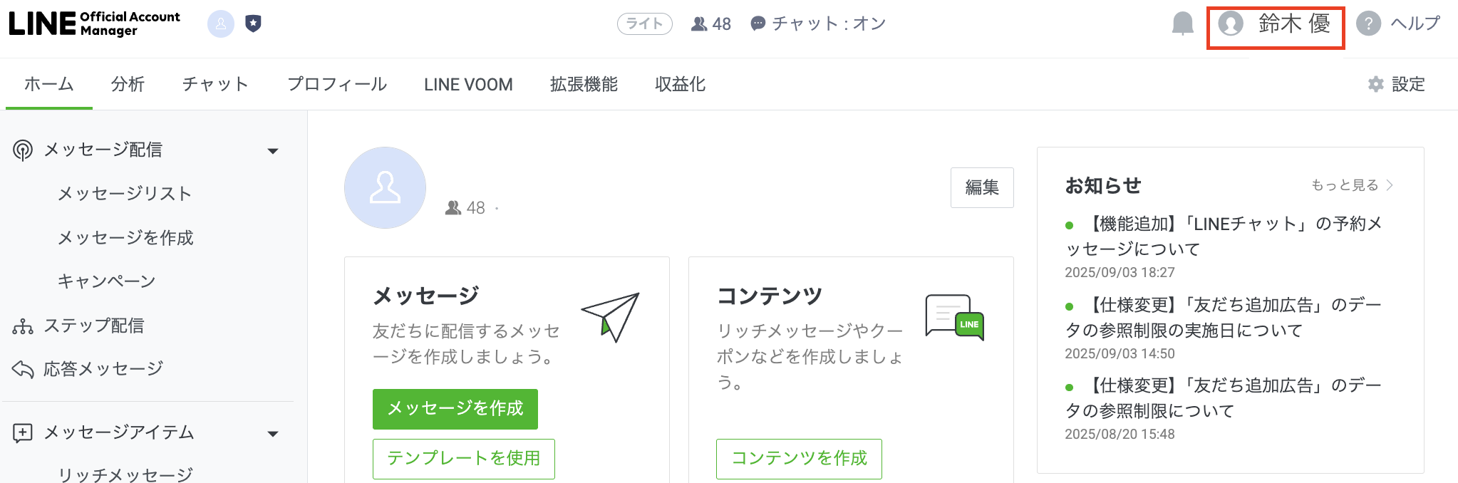 LINEアカウントを連携する/連携状態を確認するには、管理画面右上の名前をクリックします。