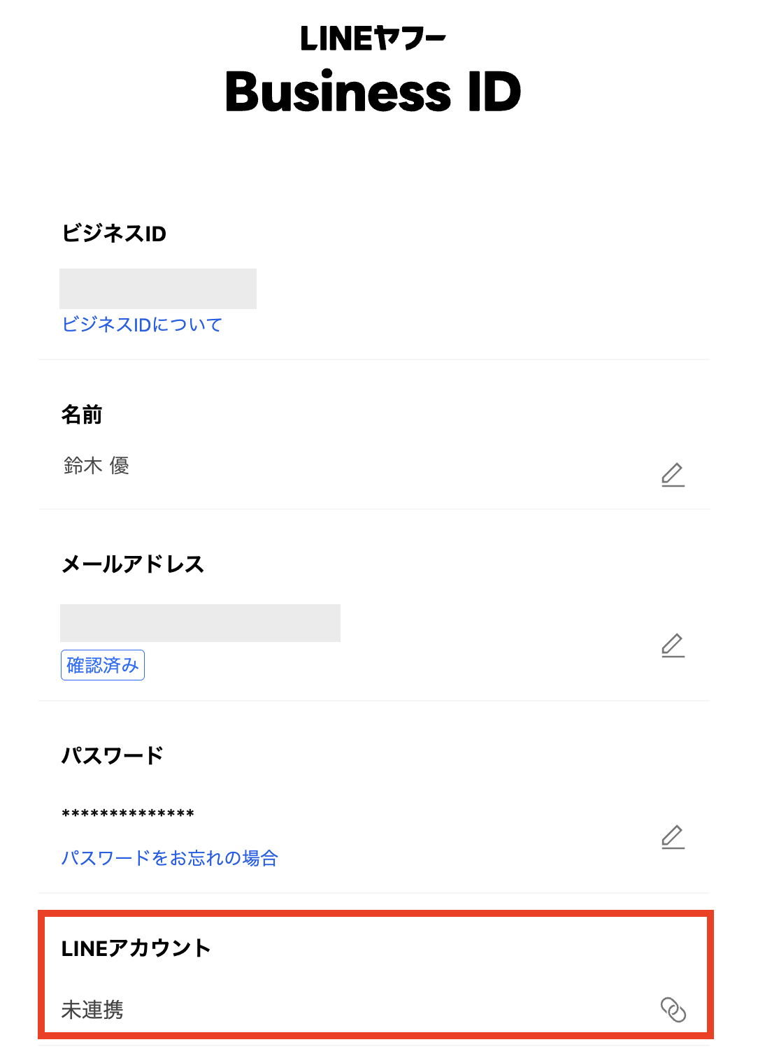 LINEヤフービジネスIDの画面で、LINEアカウントの連携状態が確認できます。