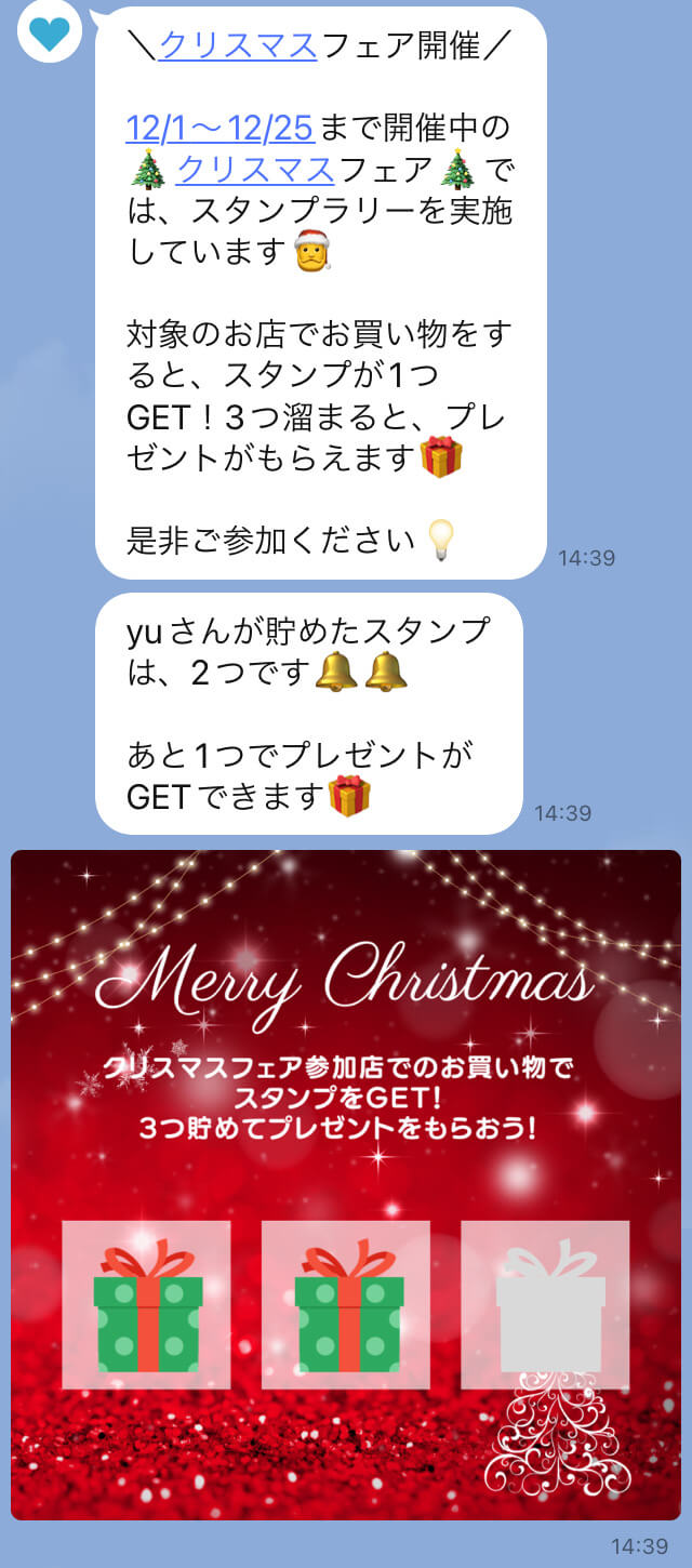 例えば、「フェアの対象店舗を回ってデジタルスタンプを集めれば、景品がもらえる」という企画を実施できます。