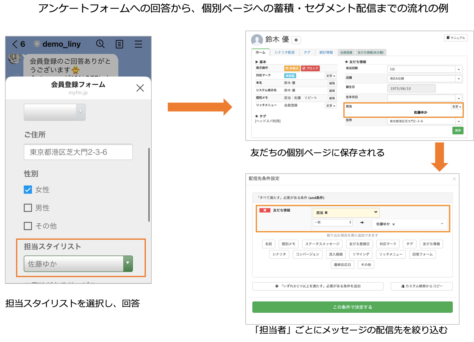 回答フォームの内容を個人の情報として蓄積し、セグメント配信に活用する