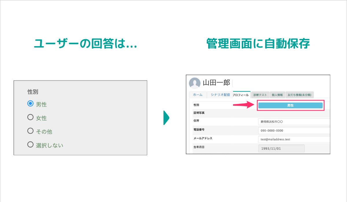 回答結果は友だちごとに自動で蓄積されるので、管理の手間がかかりません。取得した情報はセグメント配信に活用できるので、ひとりひとりにぴったりの情報を配信することが可能です。