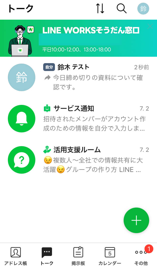 トーク機能は、主にLINE WORKSのアプリ上で、メンバーとの個別トークやグループトークができる機能です(設定によってはLINEアプリと連携することでLINE上でもやり取りができます)。