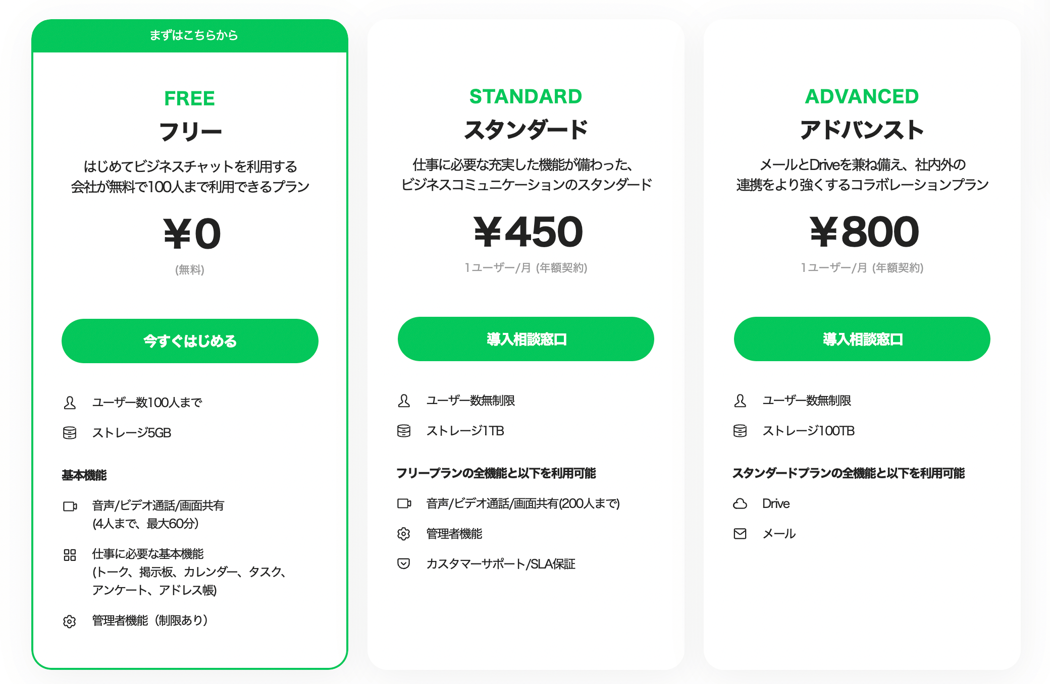 | 月額料金 | メッセージ通数に応じた3つのプラン(0円、5,000円、15,000円) | ユーザー数、機能、データ容量に応じた3つのプラン(0円、450円 / 1ユーザー、800円 / 1ユーザー)*年間契約の場合 |