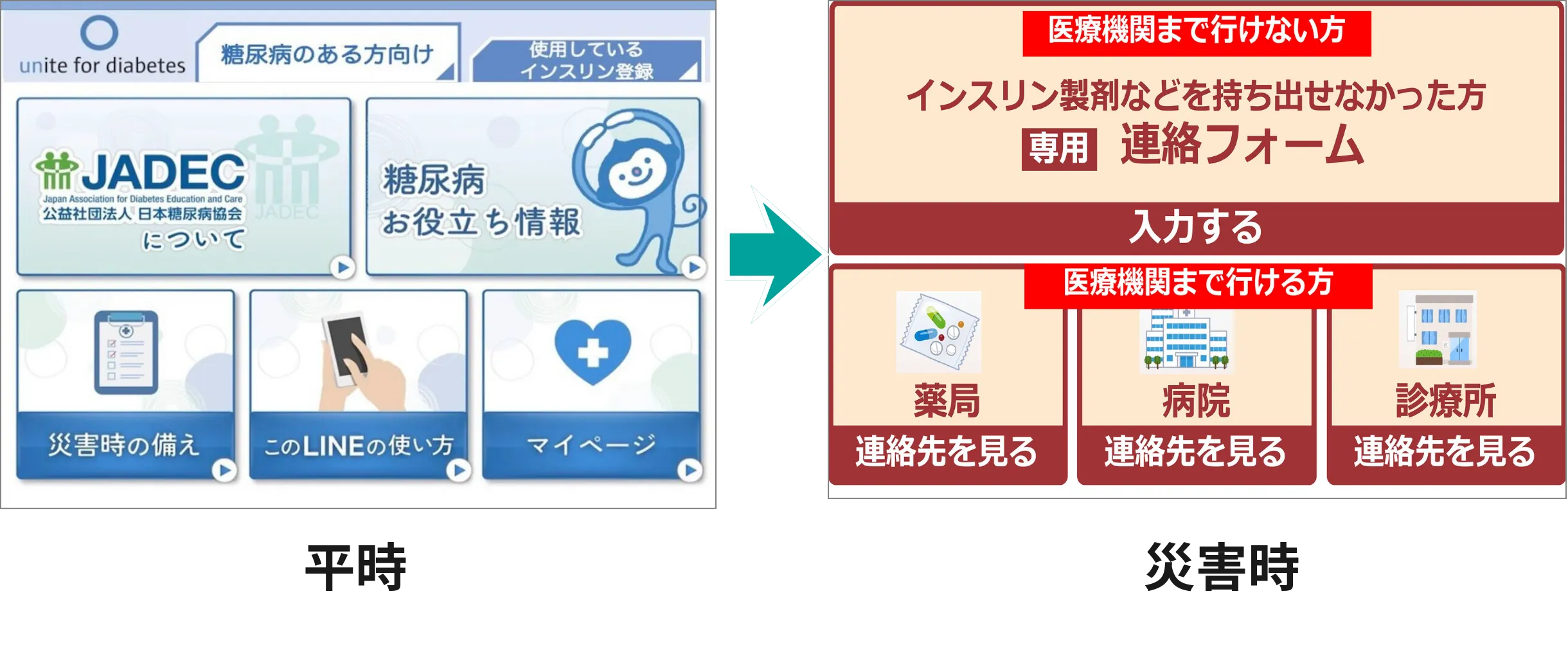 災害時には、LINEのリッチメニューを災害用の表示に切り替えるようにしています。そこで、インスリンを持ち出せなかった方に対して2つの方法で情報提供を行っています。