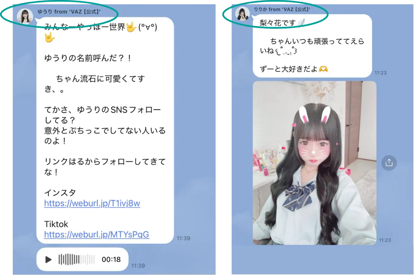 裏側の話になりますが、メンバーには「こういう仕組みを作るから、メッセージを用意してほしい」とお願いして素材を集めています。内容は本当にさまざまで、「今日もTikTok見に来てね」と自分のSNSのリンクを案内するメンバーもいれば、「学校はもう終わったの?」と、実際に会話をしているような問いかけやボイスメモを用意するメンバーもいます。